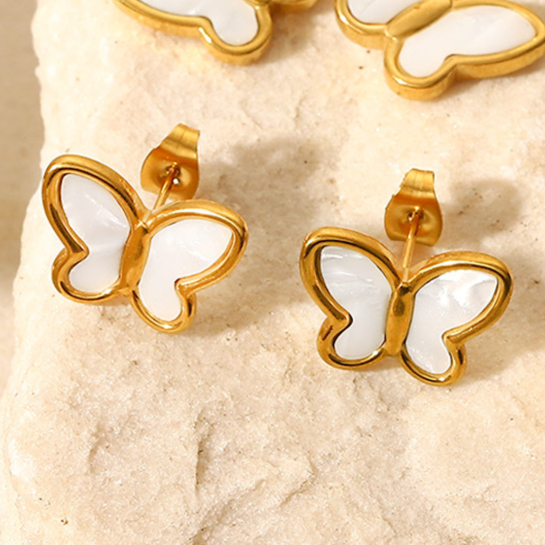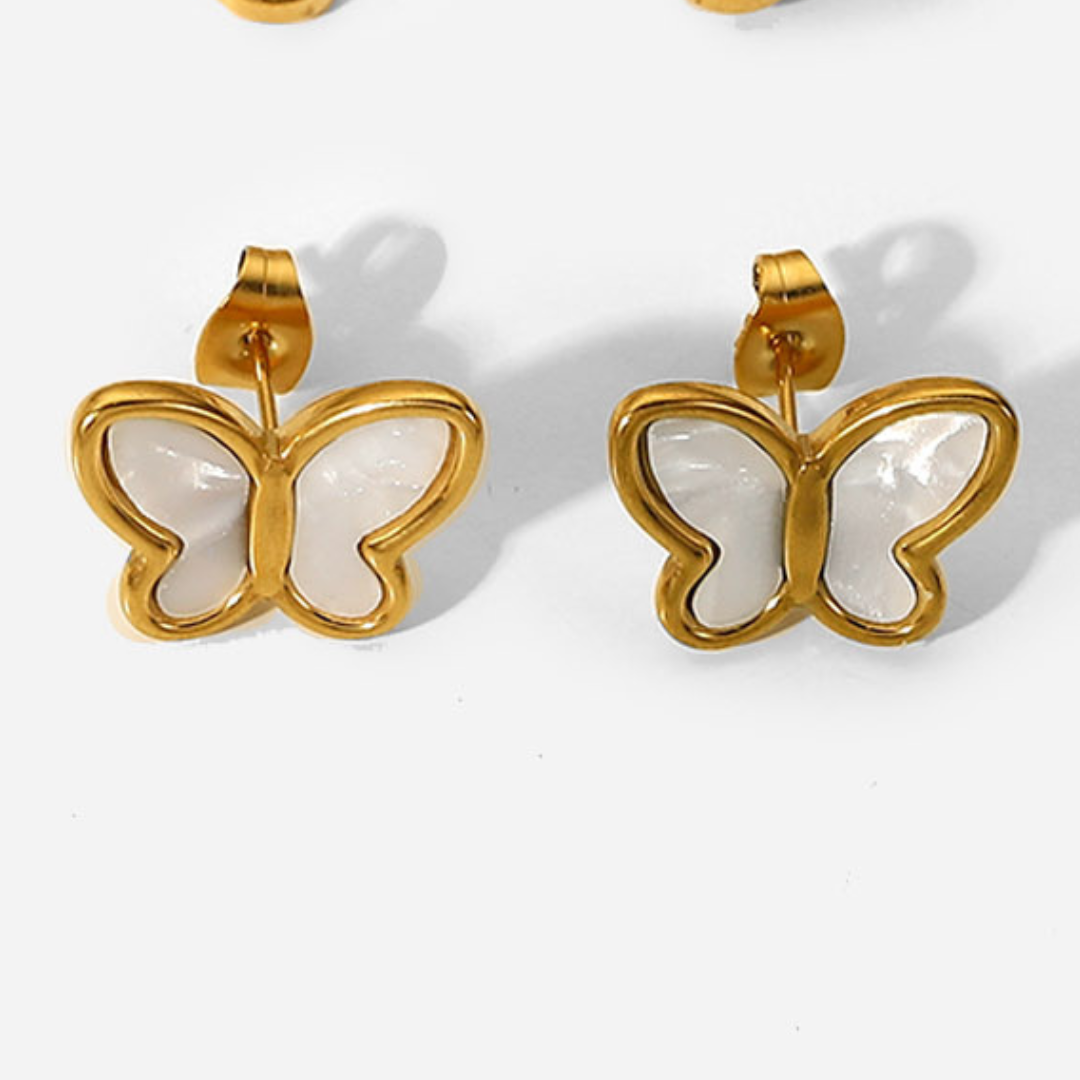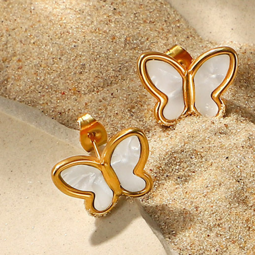 Добави елегантност и символика към стила си с позлатените дамски обици Mariposa. Изработени от висококачествена стомана с тройна 18K позлата и седефен ефект, тези обици излъчват нежност и блясък.